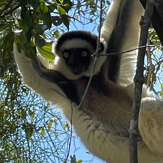 Today we continued to journey across the island, now heading west towards the coast. Our first stop was Zombitse national park, a transition zone between dry deciduous and spiny forest habitats. The park is home to magnificent baobab trees and a wide variety of lemur species, the elusive fossa, along with many birds and reptiles. We were greeted by a local guide and spotter who led us along the narrow trails of the park in search for more wildlife. It wasn’t long before our spotter was calling over the radio to our guide and we were led through dense vegetation towards a tall rustling tree. Up above large white sifaka lemurs bounced between the branches, selecting leaves to graze on. These lemurs are often referred to as “dancing lemurs” as when they venture to the forest floor they stand on their long back legs and use their forearms as balance above their heads, almost as if they are dancing as they jump. This species does not drink water and instead rely on the leaves as their source of hydration. They didn’t seem to mind our presence and continued to groom each other, feast on leaves and bounce energetically between the branches.