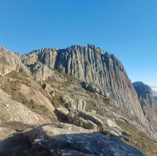 We route twisted around the side of the cliff face our camp was beneath, revealing another section of tall rock that was significantly higher. Philibert pointed to a high point in the distance, where we could just about see an outline of a pile of rocks marking the summit and it felt satisfying to see where we were heading. After a flat section, the steps commenced again but were steeper before and allowed us to make faster progress towards the summit. Although the air temperature was warm, the wind speed had increased at this height and provided a useful cooling effect, even prompting me to pull on my waterproof for a little wind protection. After further climbing I emerged onto a small patch of rock where the route ended and Philibert cheered, congratulating me and welcoming me to the summit. The summit revealed a panoramic view of the surrounding mountains and a light layer of cloud below us. As we waited for the others, I noticed how silent and peaceful it was, and we sat and admired the view before the others arrived. Philibert congratulated everyone who had made the summit and pulled out a bottle of non-alcoholic champagne from his pack, along with some plastic cups and a selection of Madagascan chocolates.